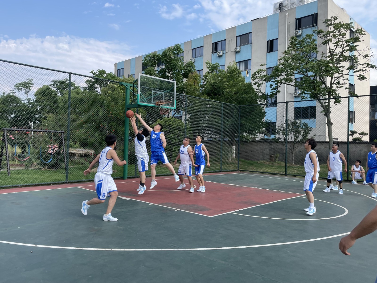 公司傅董親自為本次比賽進行跳球儀式。隨著裁判一聲哨響,整個球場立即充滿緊張氣氛,搶球、運球、掩護、突破、跳投……球員們的激情在籃球場上體現(xiàn)得淋漓盡致。場外的觀賽員工熱情高漲,歡呼聲、吶喊聲讓比賽氣氛不斷升溫。
